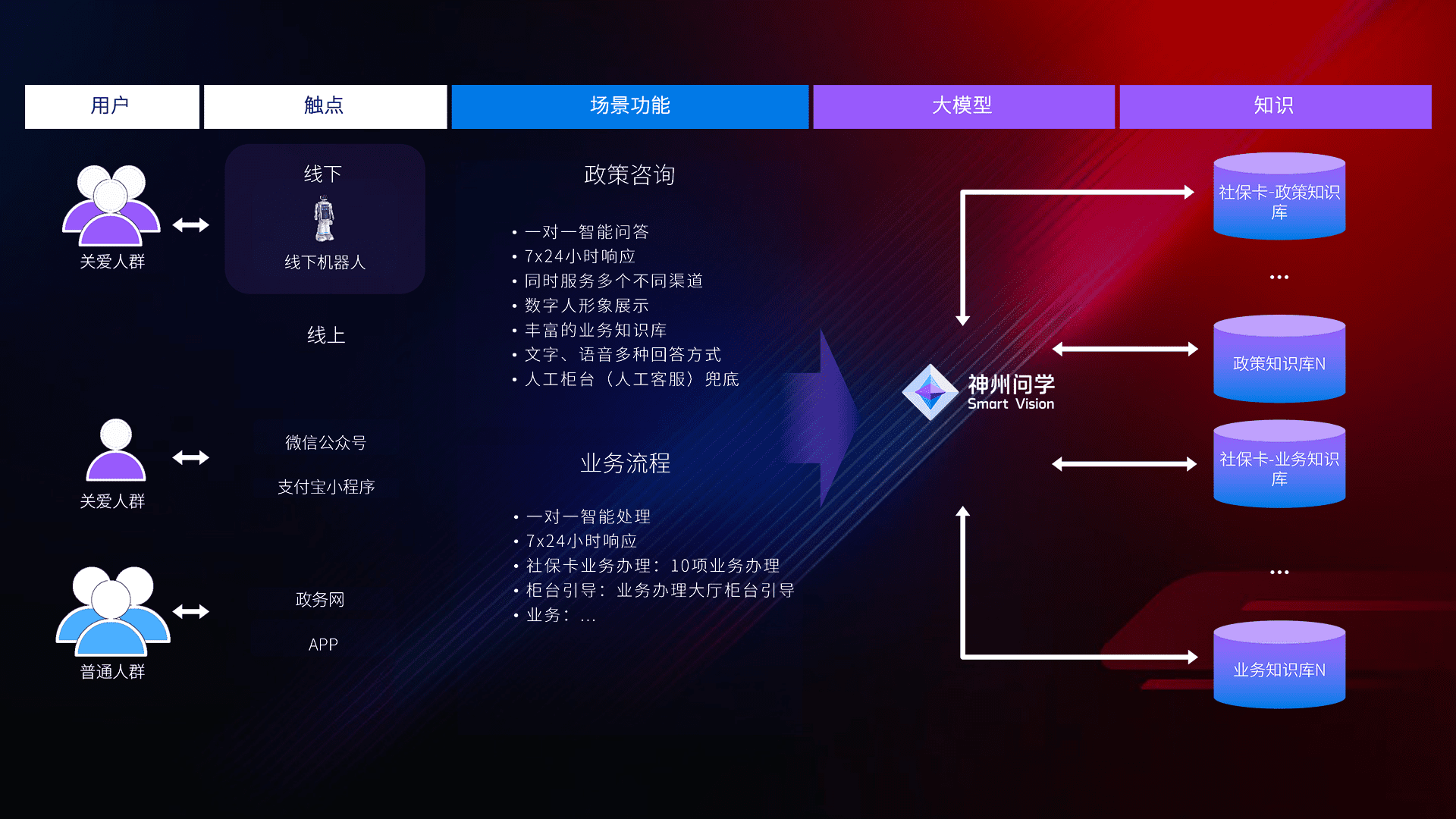 • 线上线下全覆盖:线上提供微信公众号、、、支付宝小程序、、、、政务网、、、app多种渠道,,,与线下机器人形成完整服务体系。。